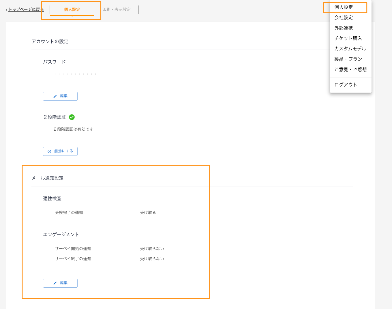 ②開いた個人設定タブの下部にある「メール通知設定」で設定を変えたい項目の「編集」を選択します。
