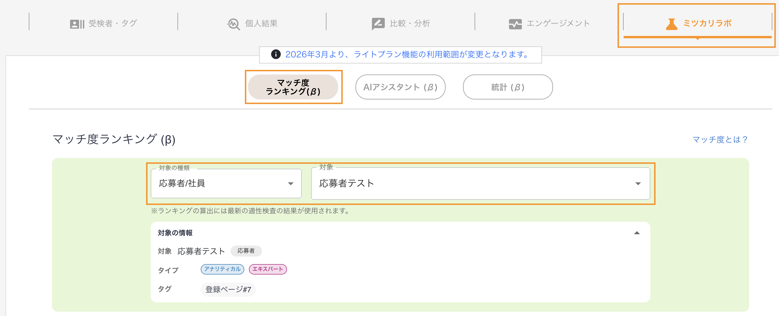管理画面のミツカリラボのタブをクリックすると、マッチ度ランキング画面が表示されます。
