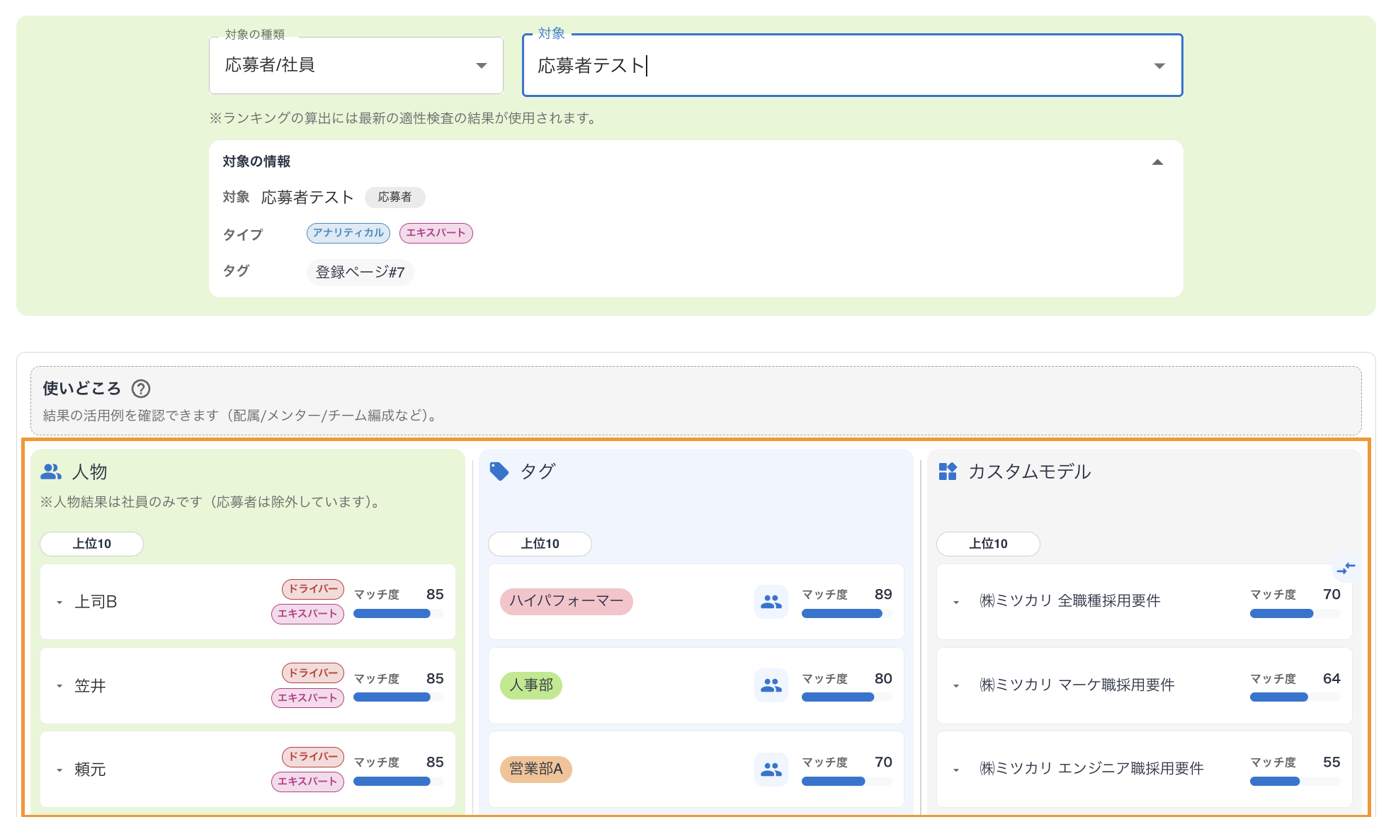ミツカリラボ内にあるマッチ度ランキングは、受検者やタグに対しての上位・下位10位までのマッチ度をランキング形式で表示する機能です。